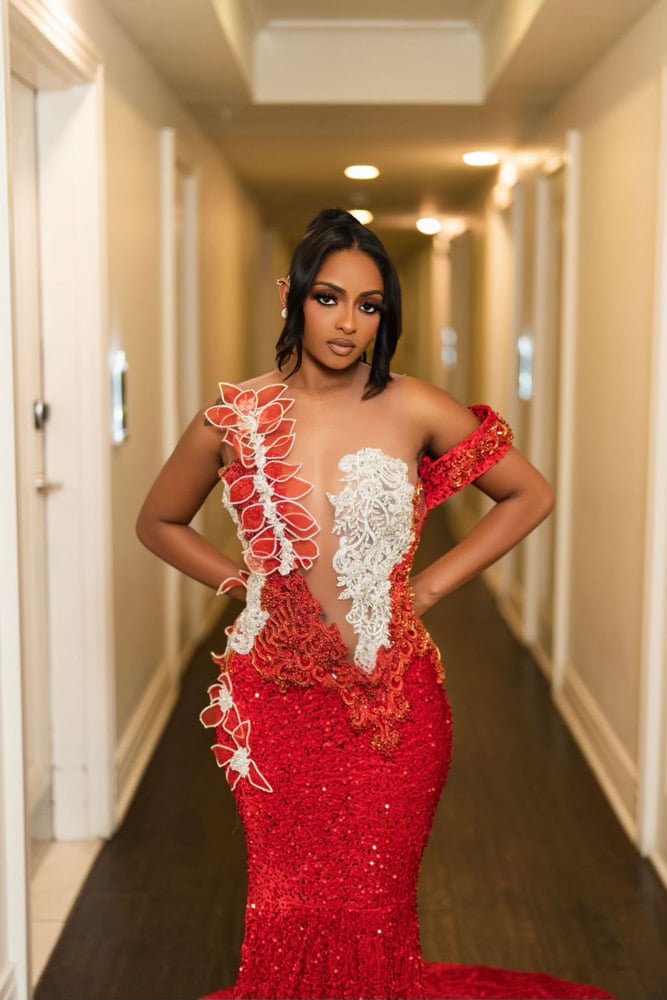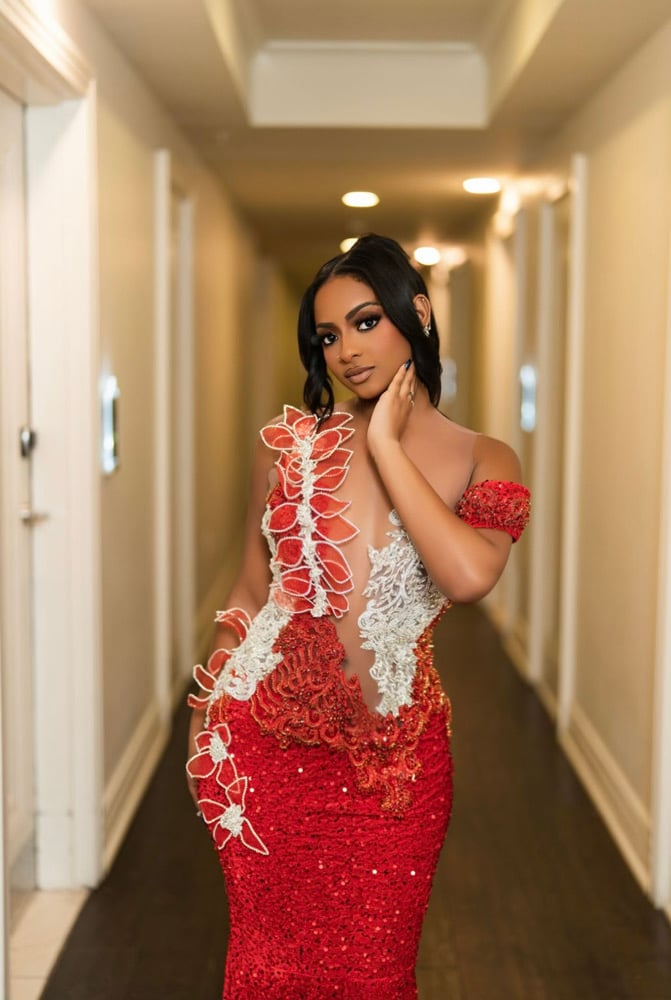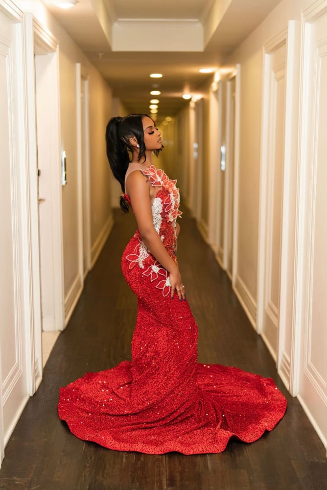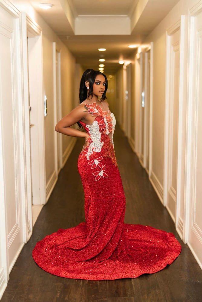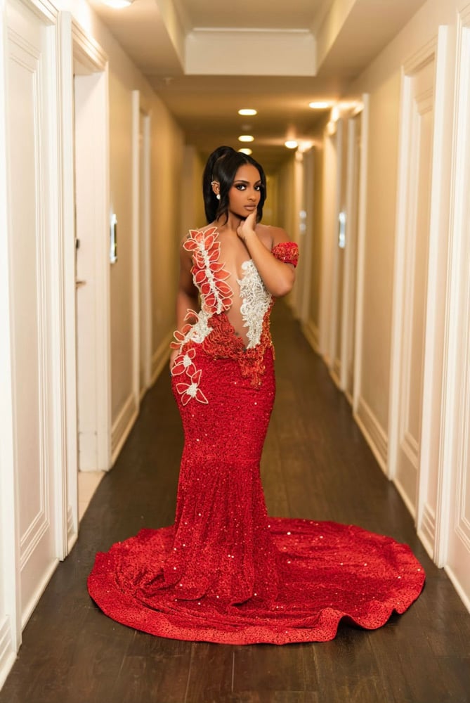 Custom gown with rhinestone flowers, spandex sequins material and skin tone mesh! Model wearing a size large, fitting sizes 10-14